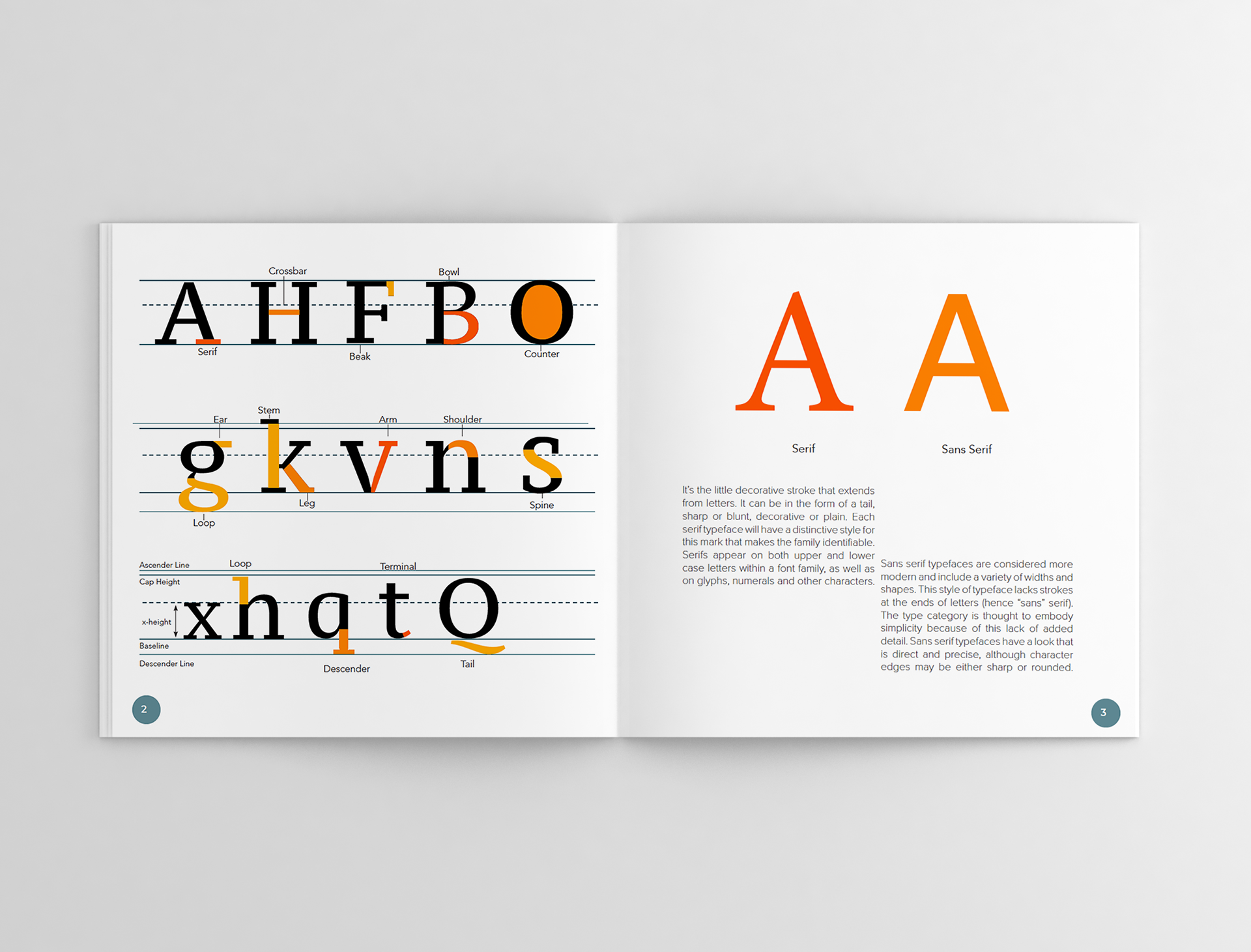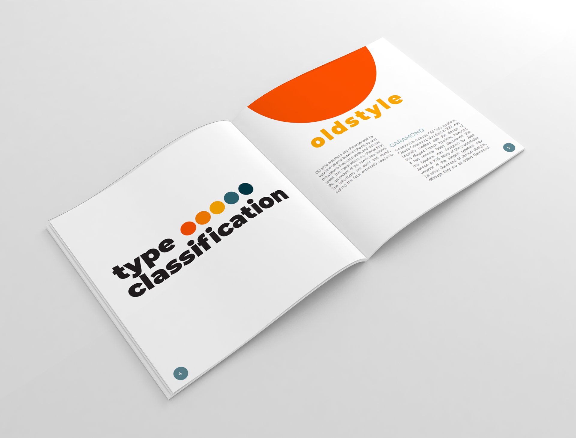 Booklet designed to show the classification, history, and anatomy of type. I chose a mix of warm color with cool colored accents which gives it a retro, yet modern feel with the use of type and fully justified alignment.
